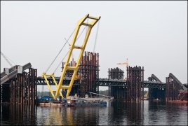Плавкран LK-600 «Захар» вышел в акваторию Днепра из гавани судостроительного завода «Ленинская кузня», где его собирали более 2,5 лет. Основная задача крана — монтаж арок Подольско-Воскресенского моста.