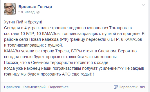 «В субботу, 7 июня, в 4 утра к украинской границе подошла колонна из Таганрога в составе 10 БТРов, 10 КамАЗов, топливозаправщика с пушкой на прицепе. В районе села Новая надежда (Россия) границу пересекли 6 БТРов, 6 КамАЗов и топливозаправщик с пушкой. КамАЗы уехали в сторону Тореза, БТРы стоят в Снежном. Вероятно сегодня ночью будет прорыв оставшейся частью колонны», – написал Гончар в Facebook.