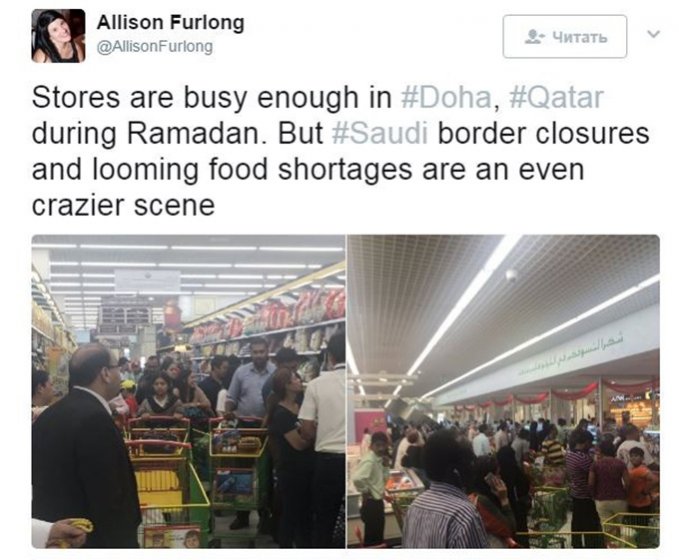 В связи с тем, что ряд арабских государств признали Катар террористическим государством и разорвали с ним дипотношения, жители Дохи принялись массово скупать в магазинах продукты. Катарцы опасаются, что страна вступит в полосу экономической блокады и, возможно, иностранного вторжения.