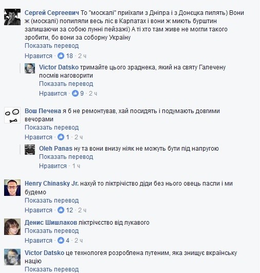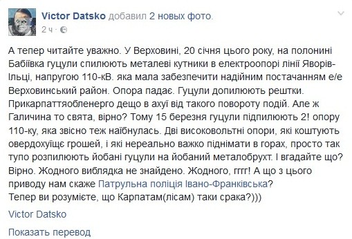 «А теперь читайте внимательно. В Верховине, 20 января этого года, в долине Бабиевка гуцулы спиливают металлические уголки в электроопоре линии Яворив-Ильци, напряжением 110-кВ. которая должна была обеспечить надежным снабжением э/э Верховинский район. Опора падает. Гуцулы допиливают остатки. Прикарпатоблэнерго несколько в ах…е от такого поворота событий. Но Галичина – святая, верно? Поэтому 15 марта гуцулы подпиливают 2! опору 110-ку, которая конечно тоже нае…лась. Две высоковольтные опоры, которые стоят овердоху…ще денег, и которые нереально тяжело поднимать в горах, просто так тупо распиливают ёба…ые гуцулы на ёба…ый металлолом. И угадайте что? Верно. Ни одного вибл…ка не найдено. Ни одного, гггг! А что по этому поводу нам скажет Патрульная полиция Ивано-Франковская?