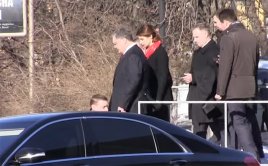 Узурпатор Петр Порошенко с женой Марией прибыл на Институтскую улицу двух одинаковых черных лимузинах Mercedes с одинаковыми номерами. В толпе раздались шутки по поводу двойников президента.