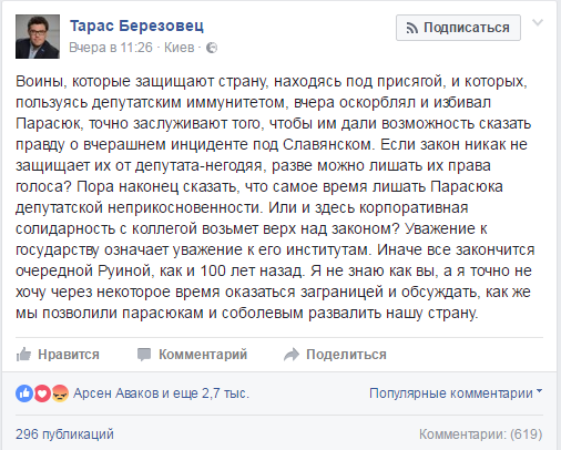 «Воины, которые защищают страну, находясь под присягой, и которых, пользуясь депутатским иммунитетом, вчера оскорблял и избивал Парасюк, точно заслуживают того, чтобы им дали возможность сказать правду о вчерашнем инциденте под Славянском. Если закон никак не защищает их от депутата-негодяя, разве можно лишать их права голоса?