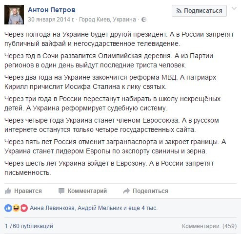 При желании можно найти и другие подобные заявления и «пророчества» сторонников евромайдана и свидомых «экспертов». Тысячи их.