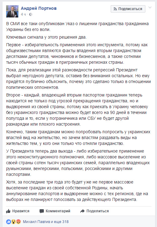 У Порошенко, по мнению Портнова, теперь два выхода — либо избирательное применение этого неконституционного полномочия, либо массовое выселение из своей страны сотен тысяч украинских семей, параллельно владеющих румынскими, венгерскими, польскими, российскими и другими паспортами.