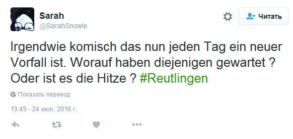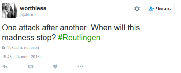 Германия снова в центре террористического внимания. Как сообщают различные источники, вчера на улицах небольшого немецкого городка Ройтлинген смуглолицый бородач устроил очередную резню — своим мачете он убил одну женщину и ранил ещё двоих.