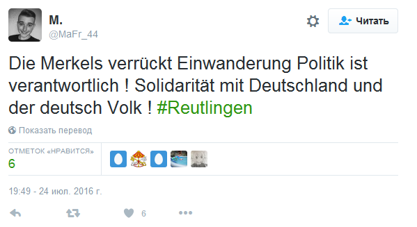 «Виновата сумасшедшая миграционная политика Меркель! Солидарность с Германией и немецким народом!» @MaFr_44