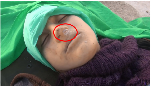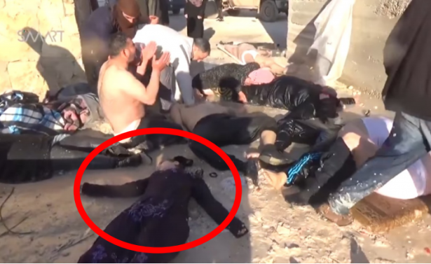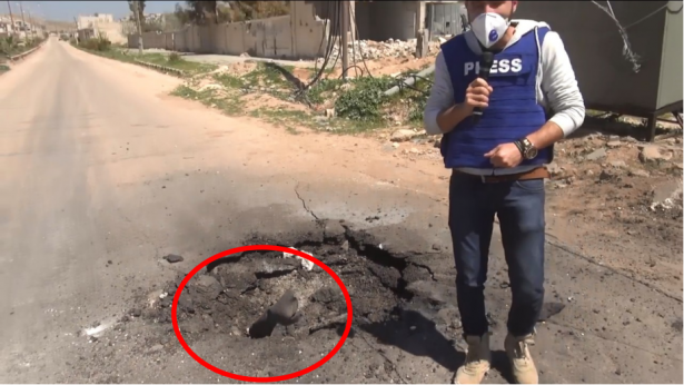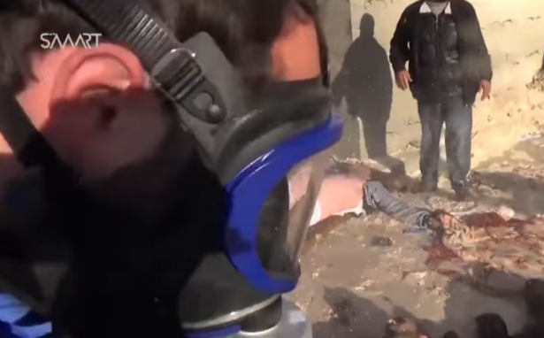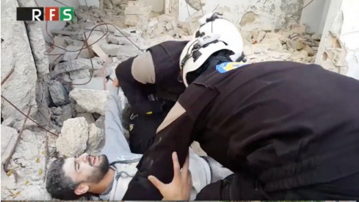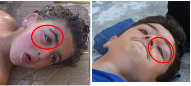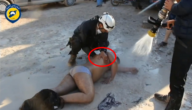 В видеосюжете видно, как представитель «Белых касок» грубо хватает пострадавшего ребенка и зачем-то бежит с ним в сторону пустыря. При этом на поспешно обрезанном кадре видно, как он замедляется после того, как сцена с его участием была отснята.