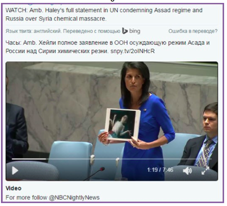 На заседании Совета Безопасности ООН представитель США Н. Хейли обвинила сирийское правительство в так называемой «химической атаке».