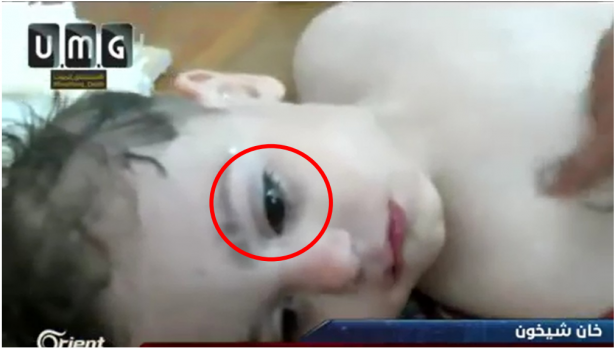 На многих кадрах нам пытаются продемонстрировать первичный признак воздействия фосфорорганических отравляющих веществ, а именно миоз или сужение зрачков. Однако, так неудачно, что на кадрах мы наоборот видим сильно расширенные зрачки – мидриаз – практически во всю радужку глаза. Такой эффект может вызвать отравление наркотическими или психотропными препаратами.
