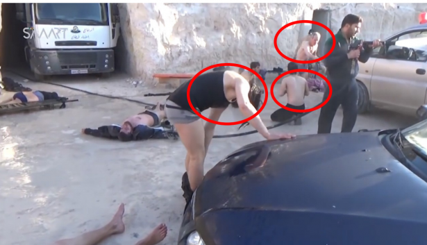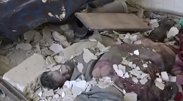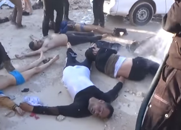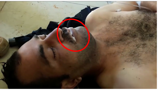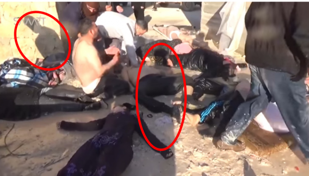 В районе 11:00 были опубликованы ролики, снятые в одном месте с разных камер, на которых пострадавших в тяжелом состоянии моют и увозят в неизвестном направлении. Судя по вытянутым теням, ролик был снят не позднее 9:30-10:00 – то есть, за несколько часов до времени нанесения удара сирийской авиации.