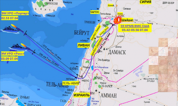 7 апреля с 3.42 до 3.56 по московскому времени из акватории Средиземного моря в районе острова Крит с двух эсминцев военно- морских сил США («Росс» и «Портер») был нанесен массированный ракетный удар 59 крылатыми ракетами «Томагавк» по сирийской авиабазе «Аш-Шайрат» в провинции Хомс.