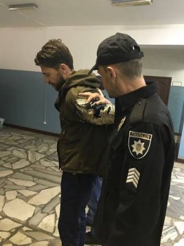 Был задержан охраной конкурса, при участии полиции — оказывал сопротивление при задержании. В порядке ст.208 КПК Украины задержан на 72 часа до суда, который выберет ему завтра меру пресечения по статье 296 ч.3 (хулиганство с отягчающими) — от штрафа до пяти лет лишения свободы.