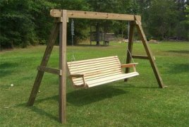 Вначале изготавливаем прямоугольную раму на лавку и спинку (если вы хотите чтобы ваши качельки не имели спинку, достаточно изготовить одну раму). К раме прибываем фанеру или рейки. Соединяем спинку и сиденье (для удобства можно сделать подлокотники). На перекладинах фиксируем скобы и закрепляем саму лавку. Вот и всё, качели готовы. Можно отдыхать. Правда, если они будут установлены в тени, иногда захочется погреться на солнышке. Ничего страшного, для таких целей всегда можно купить шезлонг или передвижное кресло-кокон.