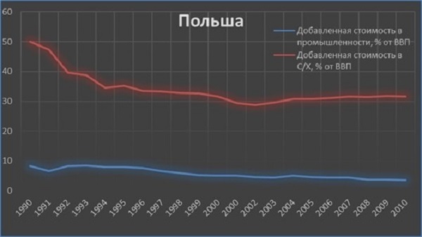 В Польше за 12 лет, с 1990-2012 год, добавленная стоимость в структуре ВВП, создаваемая промышленностью, сократилась на 21,3%. После 2004 года, за 6 лет пребывания в Евросоюзе, этот показатель улучшился незначительно — на 2,9%. Доля в ВВП добавленной стоимости сельскохозяйственного производства за аналогичный период сократилась почти вдове — с 8,3% до 4,4%.