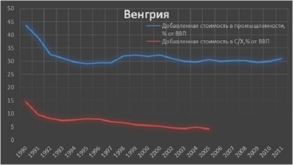 Для Венгрии настоящим ударом стало резкое падение производства в сфере сельского хозяйства – важнейшей отрасли страны. В 1980 году сельское хозяйство давало Венгрии 19,1% добавленной стоимости в структуре ВВП. В 2010 году этот показатель составил 3,5%.
