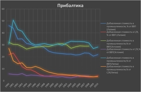 Если в Польше дела идут не очень хорошо, в Венгрии уже очень плохо, то в Латвии, а также Литве, Эстонии, Румынии и Болгарии откровенно удручающая ситуация. В Латвии доля добавленной стоимости в промышленности сократилась с 43,9% ВВП в 1991 году, до 21,8% в 2010 году. В сельском хозяйстве объем создаваемой добавленной стоимости в ВВП сократился больше, чем в 5 раз – с 21,3%, до 4,1%. Выживает латвийское сельское хозяйство благодаря сохранившимся торговым отношениям с Россией. Порядка 8,8% экспорта Латвии приходится на российский рынок. Немного больше, чем на Германию (7, 7%). Внешний долг Латвии составляет 39,8 млрд. долларов (131% ВВП)