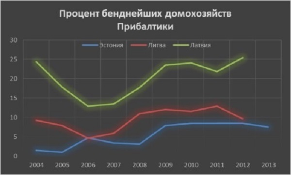 Среди прочих причин это объясняется высоким уровнем безработицы, в 2012 году составившей почти 15%, причем безработица среди молодежи достигла 28,4%. Также в прибалтийских странах за время пребывания в Евросоюзе выросло количество домохозяйств с тяжелым материальным положением.