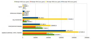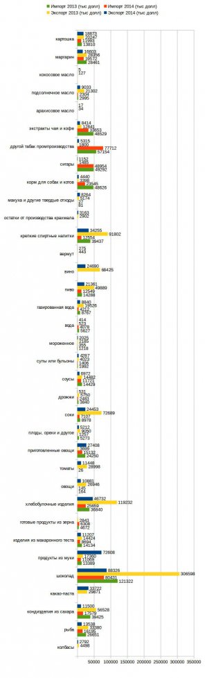 За 2014 год Украина резко сократила экспорт основных товаров в Россию. Так, готовых продуктов питания Украина продала на 589 млн 302 тыс долл, что в два раза меньше, чем в 2013-м, когда экспорт в этой категории достиг 1 164 млн 835 тыс долл.