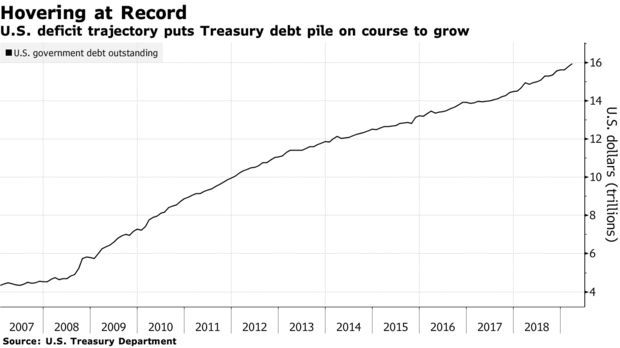 Казначейство увеличивает продажу долговых обязательств, чтобы заполнить дефицит бюджета, растущий как за счёт снижения налоговых поступлений, так и, например, за счёт роста расходов на федеральные программы типа «Medicare» в связи со старением населения.