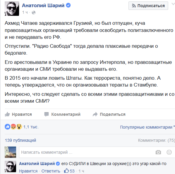 «Генпрокуратура должна установить, действительно ли Ахмед Чатаев имеет статус беженца в Австрии. Если это подтвердится, то согласно международным договоренностям Украина должна немедленно его отпустить»,— заявил Наливайченко.