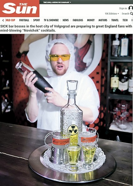 К первой игре чемпионата мира власти Волгограда готовились со всей серьезностью: все же играла сборная Англии, чьи фанаты считаются едва ли не самыми буйными на планете. И вот в волгоградских барах к приезду британцев решили отнеслись с юмором и посмеяться над пропагандистской спецоперацией британских спецслужб с якобы отравлением Скрипалей. Специально к началу мундиаля здесь создали коктейль «Новичок».