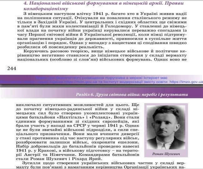 В разделе «Национальные военные формирования в немецкой армии. Проявления коллаборационизма» Грыцькив обнаружил батальоны «Роланд», «Нахтигаль», банды ОУН-УПА, дивизию СС «Галичина», а также портрет Романа Шухевича.