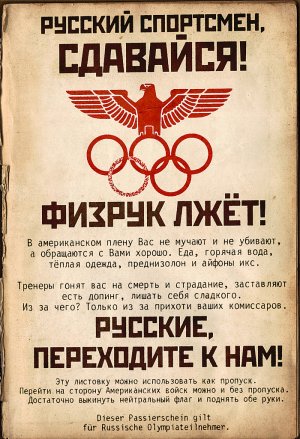 То есть, все отобранные спортсмены могут выступать на Олимпиаде хоть под семейными трусами на коряге в качестве знамени, а демонстрировать национальные символы, исполнять государственный Гимн России и вообще прославлять свою Родину категорически запрещено под угрозой дисквалификации. Единственная деталь принадлежности к России – нашивка с надписью «российский спортсмен». Как раньше гитлеровцы выдавали красную нашивку с буквами «SU» советским узникам концлагерей.