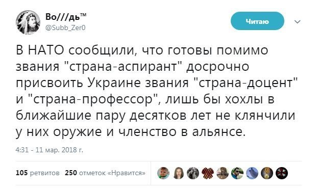 …Конечно, после новости о натовском «аспирантстве» в украинском руководстве начались возня и соцсоревнование на тему «кто больше руку приложил к счастью». Главковерх Порошенко уверял всех, что все решилось «во время моей последней встречи с генеральным секретарем НАТО в Мюнхене, а также недавней телефонной беседы с вице-президентом США». И отныне «наша следующая амбиция — План действий по членству (ПДЧ) для Украины. Именно этому было посвящено мое письмо к Йенсу Столтенбергу в феврале 2018 года, где со ссылкой на статью 10 Договора об учреждении НАТО мной было официально зафиксировано стремление Украины стать членом Альянса». Еле проталкивая слова через рот вскинулся спикер Рады Андрей Парубий: «Искренне рад и горд тем, что инициированное мной решение Верховной Рады от 8 июня 2017 года относительно членства Украины в НАТО как стратегической цели Украины, стало для этого ключевым импульсом». Даже Вова Гройсман отвлекся от поисков запасной корзинки, куда он собирается положить лишние яйца, присоседился и указал, что «реформируя страну, мы достигнем еще одной нашей цели — членства в НАТО». Дескать, без меня вы хрен правильно все реформируете…