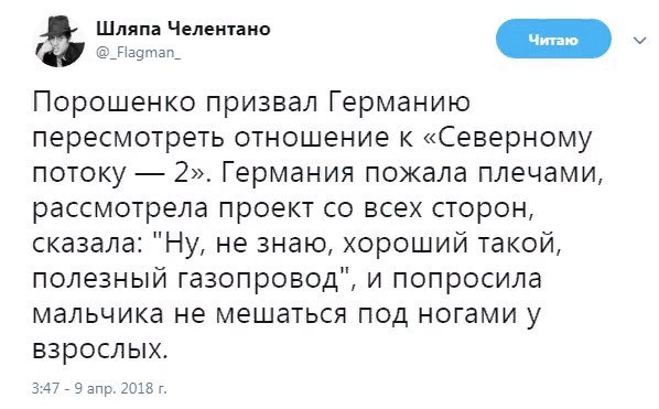 Вот просить и даже умолять Меркель как-то затормозить строительство «СП-2» Порошенко и будет в первую очередь. Унижаясь, пресмыкаясь и, не исключено, откровенно юродствуя и лизоблюдствуя. Но, скорее всего, безрезультатно. Потому что: а) это выгодно немецкому бизнесу, который не хочет уступать диктату США и покупать более дорогой американский сжиженный природный газ; б) сама Германия хоть и демонстрирует готовность выполнять союзнические обязательства перед США в рамках НАТО и ценностей «коллективного Запада», но делает это одной рукой, а другой ищет пути сотрудничества с Россией, реально видя в ней новый центр силы, с которым выгоднее сотрудничать, а не воевать. Характерно то, как и когда Берлин и Хельсинки уступил Москве. Сразу после того, как они же продемонстрировали солидарность с Лондоном в «деле Скрипалей», выслали российских дипломатов и даже поддержали международные санкции против России. Одной рукой. А другой подписали разрешение на «СП-2». А как в это время активно бесновался украинский президент, призывая не давать «зеленый свет» газопроводу, усилить санкции и даже бойкотировать Чемпионат мира по футболу в России, и говорить не стоит. Но словесное беснование в Киеве оказалось не только тупым, но и бесполезным – его (Киев) похерили…