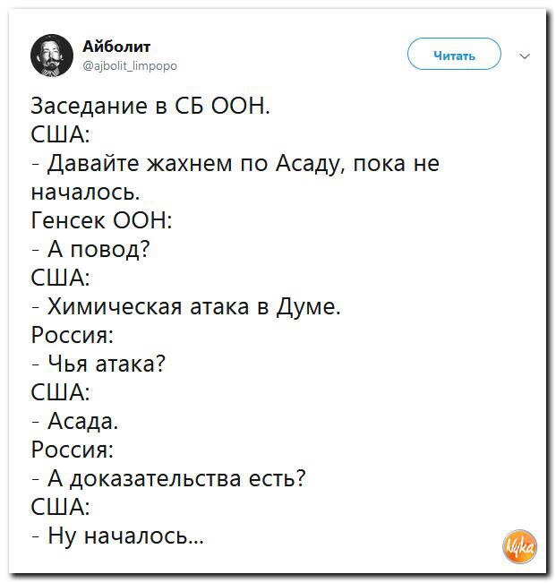 А пока представительница Соединённых Штатов в ООН бьётся в истерических припадках и пытается создавать из России образ врага и монстра в лучших традициях доктора Геббельса. Так что в одной руке у Небензи должны быть таблетки галоперидола, а во второй, на всякий случай — армейский огнемёт.