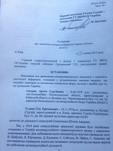 Совершенно прелестный документ подогнали из СБУ. Выглядит как настоящий, с гифом «Совершенно секретно», с натуральной подписью Павла Демчины (первый заместитель главы Службы Василия Грицака). Только подписи в конце и печать прикрыты специальной бумажкой. А содержание доставляет.