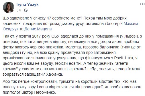 Этот простой факт дошёл даже до такой эпической дуры, как «писательница» (кто-нибудь видел её книги?) Лариса Ницой. Которая прямо заявила, что существование этого списка позволяет СБУ убить любого из него полностью безнаказанно.