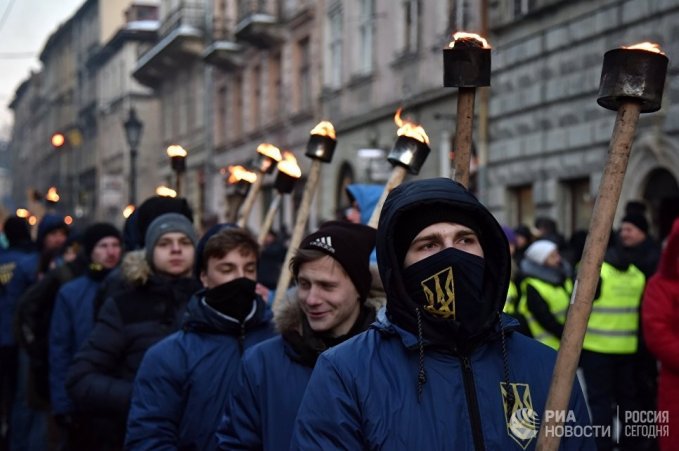 Участники факельного шествия активистов праворадикальных организаций, приуроченного ко дню гибели главаря бандитов УПА Романа Шухевича 5 марта 1950 года