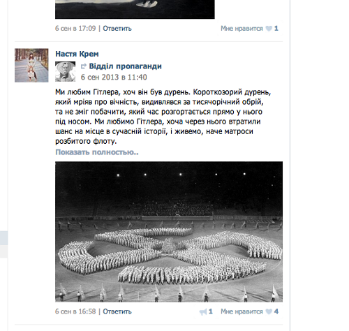 «Мы любим Гитлера…» – пишет она с наивной детской непосредственностью на своей страничке в соцсети ВКонтакте, где зарегистрировалась под псевдонимом Настя Крем, забывая, наверное, что за такой, как у нее, разрез глаз Гитлер мог и в печи сжечь. Писала об этом Настя еще в 2013 году… До сих пор взгляды не поменялись…