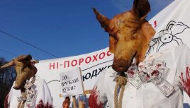 Нацисты перекрыли движение по Хмельницкому шоссе и, выкрикивая лозунг «Свинарчуков за решетку!», с плакатами «Нет – порохососам!» и отрубленными свиными головами направились к месту встречи нелегитимного президента Порошенко с избирателями.