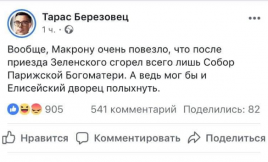 Тарас, как все уже знают, достойно связал пожар в Нотр-Даме с визитом клоуна в Париж. Хорошо, говорит, что Елисейский дворец не сгорел. Креативно, свежо и хайпово. Мгновенный успех поста. Всеобщее признание и критика посла Франции в Украине. Тысячи «порохоботов» люто позавидовали успеху своего более смелого и продвинутого коллеги. Вот почему именно этому утырку, а не им пришла в голову мысль связать пожар с клоуном? Потом, правда, попустило, поскольку, повторюсь, времена немного другие настали. Березовца стали троллить. А когда появился возмущенный твитт французского дипломата, ведущего с «несгораемым пердаком» стало слегка штормить. Понимаете, какое дело… У нас, конечно, безвизовый режим, однако шоппинг в «Галери Лафайет» может накрыться. Лучше «потереть» и написать красивое оправдание. Что Тарас блестяще и исполнил в стиле лидера «порохоботов». Он как бы и извинился, но дал понять, что Зеленский все равно является дебилом.